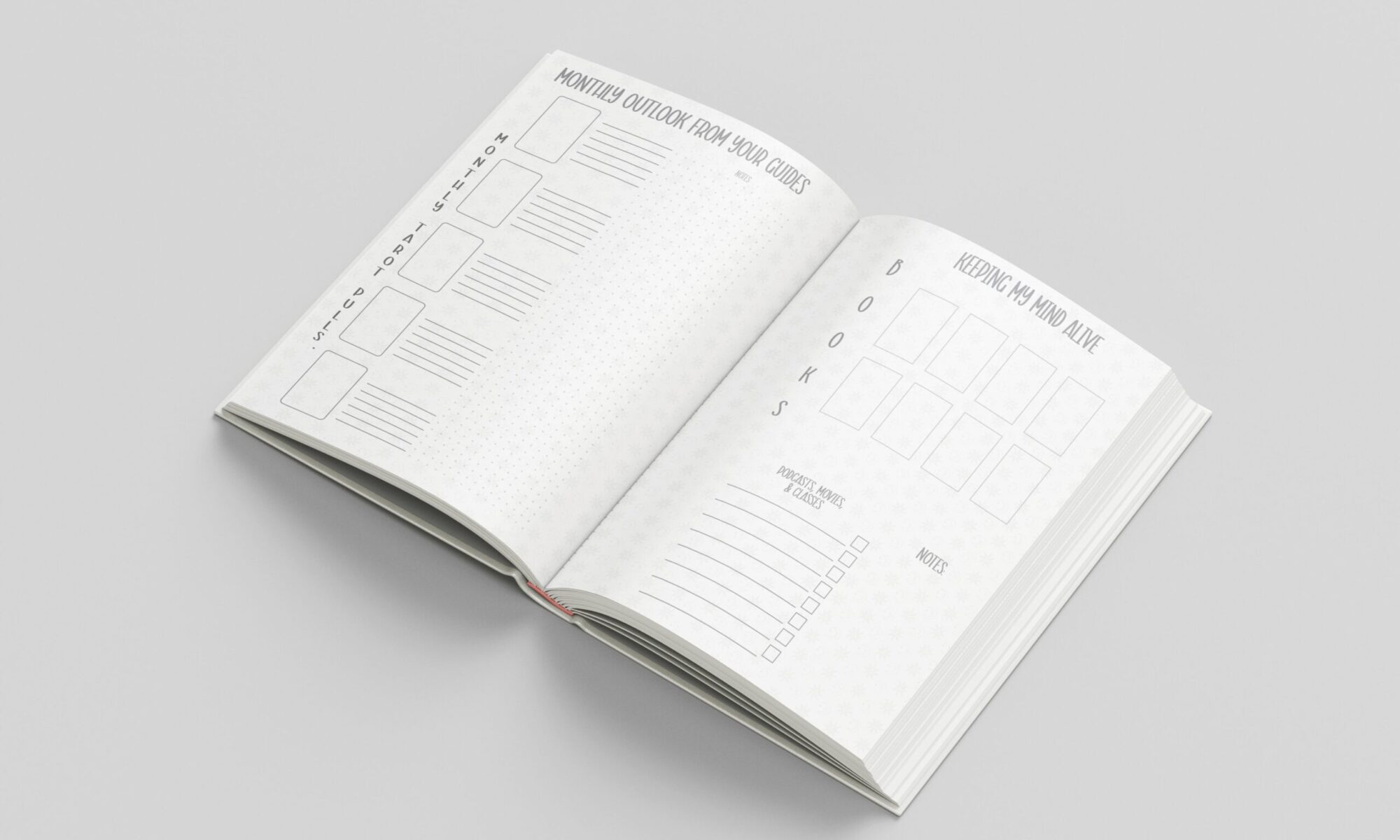 - 2 page spread for astrology transits, 5-card tarot pulls, monthly books read tracking, moon/mood tracker
